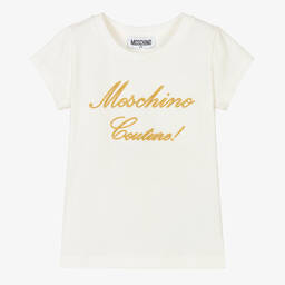 A bold black Mini-me cotton T-shirt for girls by Moschino Kid-Teen. Glittering on the front is the label's embroidered 'Moschino Couture!' script logo in eye-catching gold threads. This soft and comfortable top has a crew neckline and feminine capped sleeves.