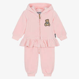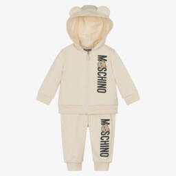 An ivory Mini-me tracksuit for girls by luxury Italian fashion house Moschino Kid-Teen, with black logo prints for designer appeal. Casual and comfortable, it is made in mid-weight cotton jersey, with a cosy fleecy inside. The zip-up top is hooded and has side seam pockets. The joggers have useful front pockets and an elasticated waist for a snug fit.