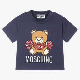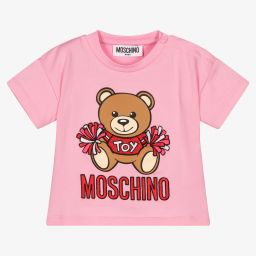White T-shirt for little girls by Moschino Baby, made in soft cotton jersey. Fastening with poppers on the shoulder, it has an adorable embroidered cheerleader Moschino Teddy Bear logo on the front.