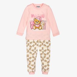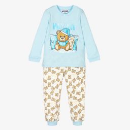 Grey and ivory trouser set for little boys and girls by luxury brand Moschino Baby. Made from soft cotton jersey, the grey top has a Moschino Teddy Bear in pyjamas logo on the front, and the ivory and grey trousers are patterned in a matching Teddy logo print.