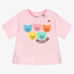 Ivory T-shirt for little boys and girls by luxury Italian designer Moschino Baby. Made in comfortable cotton jersey, it has the brand's colourful Teddy Bear logos printed on the front. There are useful button fastenings on one of the raglan sleeves.