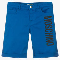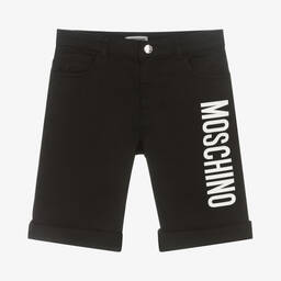 White shorts for teen boys by Moschino Kid-Teen, with a large black logo print on the front. These Bermuda-length shorts have classic five-pocket styling, with a zip and branded popper fastening. Comfortable and easy to wear, they are made in soft, smooth cotton twill, with a slight stretch.