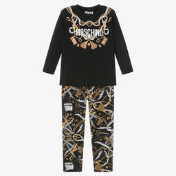 Inspired by the adult collection, an ivory and black leggings set for teen girls by Moschino Kid-Teen. The ivory tunic top has a sewing-themed chain print in gold, with fun logo details and a bold black logo across the front. The stretchy black leggings have an elasticated waistband and a matching pattern in gold and ivory. This eye-catching set is made in soft and comfortable cotton jersey.