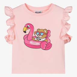 Teen girls white flamingo T-shirt is by Moschino Kid-Teen. The iconic Moschino Teddy Bear, wearing heart-shaped sunglasses, is boldly printed on the front while relaxing in a bright pink inflatable flamingo. This soft cotton jersey T-shirt features a ribbed neckline and pretty frills on the sleeves, adding a feminine touch. Limited quantities available, making it a last chance to buy this charming piece.