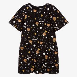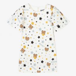 Teen girls ivory dress by luxury Italian brand Moschino Kid-Teen. The jersey fabric is patterned with silver grey logos, glittery gold stars and the brand's Moschino Teddy Bear logo. The short sleeves are fluted and wide, and there are side seam pockets and a back zip fastening.