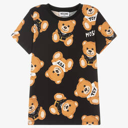 Ivory T-shirt for teen girls and boys by Moschino Kid-Teen. This cute statement tee has an all-over print of the designer's signature Moschino Teddy Bear logo and is made in soft cotton jersey.