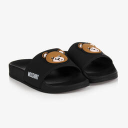 White sliders for teen boys and girls undeniably by Moschino Kid-Teen, with the brand's iconic brown rubberised Teddy Bear on the foot strap, and a printed black logo on one side. All-day comfortable, the soft footstrap is fully lined and the footbed is moulded. They have a non-slip sole.