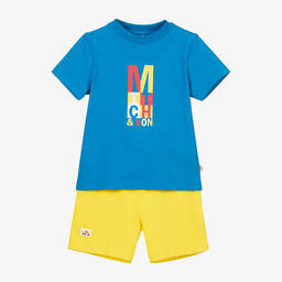 Both comfortable and casual, this turquoise blue cotton shorts set for little boys is by Italian brand MSGM. Made in stretchy jersey, both the T-shirt and shorts have a white, varsity-style logo. The T-shirt has popper fastenings on one shoulder to make dressing easy, and the shorts have an elasticated waistband, just right for little tummies, with useful, concealed side pockets.