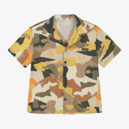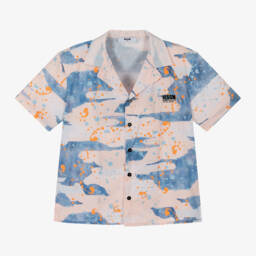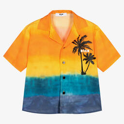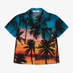 Teen boys blue cotton palm tree shirt by MSGM features a sunset scene print with palm tree silhouettes and a logo label stitched on the back. This short-sleeved shirt comes with a revere collar for a laid-back look and branded front button fastenings. Made from soft, lightweight cotton poplin, it ensures cool and comfortable wear. Limited quantities available, last chance to buy this unique piece.