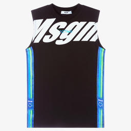 Teen boys white sleeveless T-shirt by Italian brand MSGM, made in soft cotton jersey. There are black logo trims on the sides, with orange and red stripes. A large black logo is printed on the front, with the word 'active' in red letters.