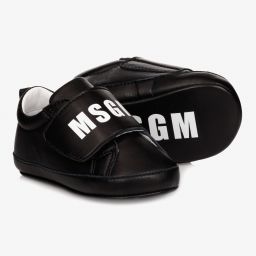 White pre-walker shoes for baby boys and girls by MSGM. They are made in soft leather and have a velcro fastening strap with a black logo print. The brand's logo name is printed in black on the sole.