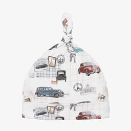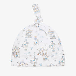 A sweet white supima cotton hat for baby girls by My Little Pie, made in the softest jersey. This charming hat features a delicate flamingo, swan, and floral pattern, with a neat knot on top and a protective fold-over brim. Perfect for shielding delicate heads, this hat is crafted to provide comfort and style. Last chance to buy, with limited quantities available.