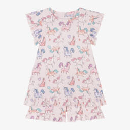 Girls white honey pyjamas by My Little Pie, crafted from the softest organic Supima cotton jersey. Adorned with charming yellow and beige prints of bears, bees, hearts, and honey pots, these pyjamas offer both comfort and cuteness. The elasticated waist on the shorts ensures a snug fit for a cosy night's sleep. Limited quantities available – last chance to buy this delightful sleepwear.