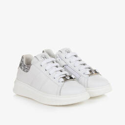 White and gold trainers for girls from Naturino, with a sparkling glitter panel on the heel. Lightly padded on the ankle and inner sole, these beautifully soft leather shoes are designed to support feet as they grow. The insole and lining are made from leather for added comfort. They have flexible, rubberised soles, a logo label on the tongue, and a sweet gold-tone plaque with a heart cut-out design on the toes. Easy to slip on, they are designed with laces, a side zip fastening and velcro tab for neat, simple dressing.
