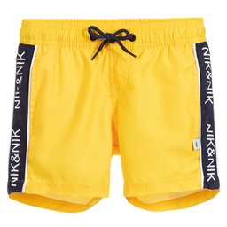 Boys green swim shorts by Tommy Hilfiger, with black and white logo stripes on the sides. Made in mid-weight silky-feel polyester, they have a useful, elasticated, drawstring waist and a soft mesh lining. They come with a matching storage pouch.