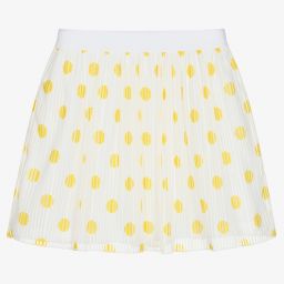 Girls white skater skirt from Oilily, with a colourful floral pattern. It is made in soft linen and has a lightweight cotton lining. The elasticated waistband has a green drawstring tie and there are useful side pockets.