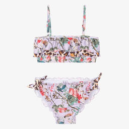 Teen girls pink floral bikini by Olga Valentine features bold leopard print trims, making it a standout style for the resort. The bandeau top is decorated with layered ruffles, while the frilly bikini bottoms boast side bows. Adjustable shoulder straps on the top ensure a beautiful fit. Crafted from silky smooth UPF50+ fabric with full lining, this swimwear piece is perfect for sun-soaked days. Limited quantities available, last chance to buy.