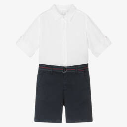 The boys beige and white belt-accented shorts set offers a smart-casual look by Patachou. This charming ensemble features a lightweight cotton and linen blend shirt with practical button tabs on the sleeves. The cotton twill Bermuda shorts boast an adjustable waist for a perfect fit and come with a detachable navy blue belt. Subtle logo embroidery adds an elegant designer touch to both pieces. Limited quantities available—don't miss out on this stylish set for the warmer seasons.
