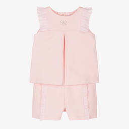Lovely navy blue cotton shorts set for girls by classic Portuguese brand Patachou, made in soft, comfortable jersey. The top has a sparkling diamanté bow with a pearlescent logo charm on the front, and ruffle-trimmed shoulders. There are popper fastenings on the back. The pretty, coordinating shorts have ruffled front seams and a stretchy elasticated waist for a good fit.