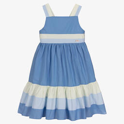 Girls coral pink sleeveless dress by Patachou, made in soft cotton poplin. Lined for comfort, it has gorgeous pastel orange and ivory stripes all-over. The bodice has a rose gold logo charm embroidered on the waist for a glamorous touch. The skirt has a lovely tiered effect for a feminine silhouette, and it fastens seamlessly with a concealed zip on the back.