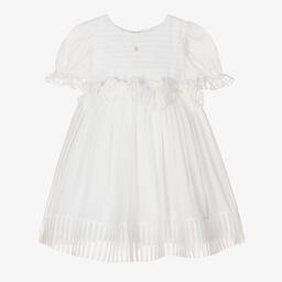 A pretty pale green dress for girls from Patachou, made from lightweight chiffon. This beautiful dress has lightly elasticated sleeve cuffs and tonal bows for a feminine finish. The A-line skirt has volume and moves freely ideal for twirling. The panels and trims of sheer striped chiffon add texture to the look. It has a concealed zip fastening on the back for fuss-free dressing and is fully lined for added comfort.