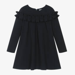 Girls beautiful, navy blue, hooded cape by Patachou, edged with a navy blue, faux fur trim, adding a luxurious touch. The cape is made from a lovely, softly-textured jacquard, which has a blue shiny thread running through it. Lined in silky polyester, the style has slits through which to place arms, two front pockets to keep little hands cosy, and secures at the front with a hook and eye fastening.