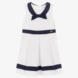 Lovely nautical inspired navy blue and white dress for girls by Patachou. It is made in cotton jersey with a soft brushed feel with a lined bodice for added comfort. This sleeveless style has a white collar with a bow underneath and a subtle metal logo plate on the waist. It fastens with a zip on the back seam for a neat finish.