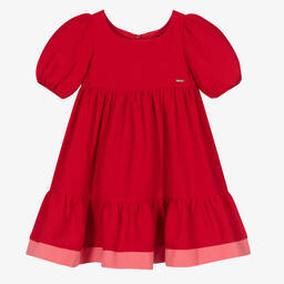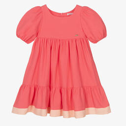 Girls coral pink dress from Portuguese brand Patachou, made in soft woven cotton with a lovely textured feel. With puffed sleeves and a loose flared skirt, it has a beautiful shape without restricting movement. There is a branded rose gold metal logo plate on the front and the hem is trimmed with contrasting pale pink for a fun finish. The zip fastening is neatly concealed on the back.