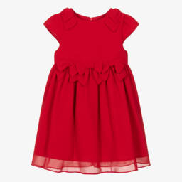Exclusive to Childrensalon, this gorgeous red dress for younger girls is by Patachou. Made in soft lightweight chiffon, it has cute capped sleeves, with fixed bows on the shoulders and waist. The full, gathered skirt has a tulle frill on the cotton lining for extra volume.