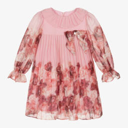 Green dress for girls by Patachou. Made with lightweight chiffon, it has pretty ruffles on the shoulders, with green velvet trims, waistband and bow. The full skirt is lined with layers of cotton and tulle. It has buttons on the sleeves and fastens with a zip on the back.