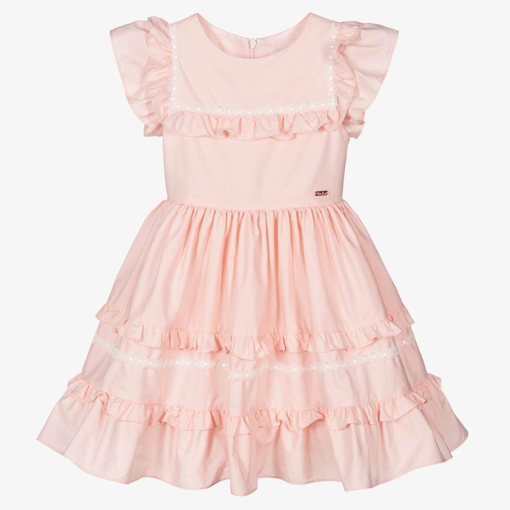 Pale pink dress for girls by Patachou, made in lightweight cotton. The bodice has a frilled bib front with white lace trims, ruffles over the shoulders and a rose gold logo tab by the waist. Fully lined, the gathered skirt has matching frills and trims.