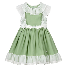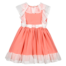 A lovely coral pink dress for girls by Patachou, with ivory ruffles and bows. Made in sheer chiffon, it has a cotton underskirt and a tulle-trimmed cotton lining. The dress fastens with a concealed zip on the back.