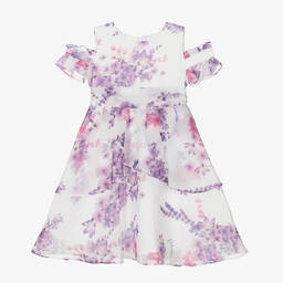 Beautiful white dress for girls by Patachou, exclusive to Childrensalon. Crafted in beautifully soft chiffon, the fabric is patterned with stunning blue and green flowers for a truly feminine look. A ruffled open-shoulder detail, sash to tie into a bow on the back, and cascading tulip-effect layers on the skirt add elegance to this lovely piece. The cotton lining is soft and comfortable, and the dress fastens with a hidden zip on the back for a neat look.