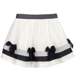 White skirt for girls by Patachou, made in soft, lightweight chiffon, with green trims and bows. It has a double cotton lining, with soft tulle for added volume. It fastens with a button and zip on the side and has a useful adjustable waist.