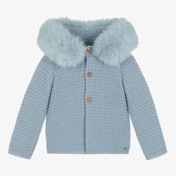 A dark grey knitted jacket for little boys and girls by Paz Rodriguez, in a soft Merino wool blend. Cosy and classical, this layering piece has wooden button fastenings on the front, with a removable faux fur trim that attaches to the hood with buttons. A silver charm logo is featured on the hem.