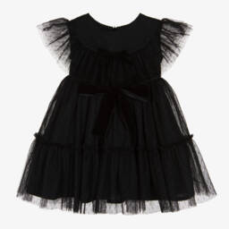 Pale pink dress with a white bodice for girls by Phi Clothing, made in lightweight cotton. The gathered skirt has a deep frill around the hemline, which is longer around the back than the front. The back is elasticated, with long sash ties to form a large bow.