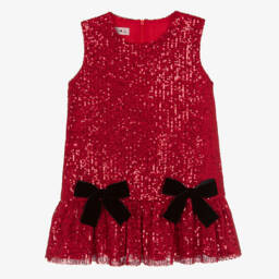 The girls red sequin bow dress by Phi Clothing exudes elegance with its dazzling red hue. Crafted from shimmering tulle with rows of sequins and accented with chic black velvet bows, this dress promises to make a statement. The soft cotton lining provides comfort, while the concealed zip at the back offers easy wear. Suitable for special occasions, this sleeveless design is a last chance to buy, with limited quantities available.