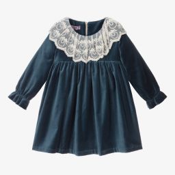 Pink dress for girls by Phi Clothing, made in soft cotton velvet. It has a pretty ivory lace collar and elasticated cuffs. There is a concealed zip fastening on the back.
