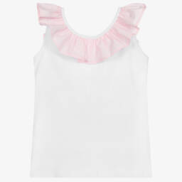 White cotton bandeau top for girls by Piccola Ludo. There is a white ruched elasticated band underneath a soft white cotton frilly layer. The white cotton is trimmed with navy blue stitching and has navy blue and neon pink tassels.