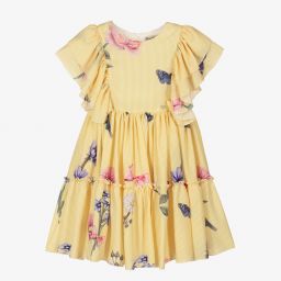 Girls lovely dress in light blue and white stripes from Piccola Speranza, with a colourful all-over floral print. Lined in soft cotton, it is made in silky crêpe with pretty ruffles over the shoulders and around the hem.