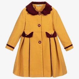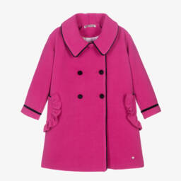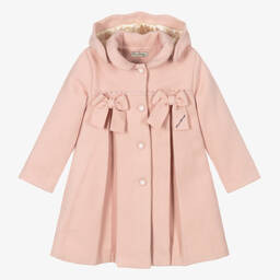 Lovely pale pink coat for little girls by Piccola Speranza, made in soft felted polyester fabric. In a classic silhouette, it has two front pockets trimmed with cute flowers and a fixed bow, with a navy blue logo print. Fastening with buttons and with a silky lining, it also has frilly trims across the front and back.