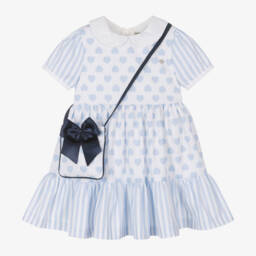 The white blouse and Navy Blue dress set for girls by Piccola Speranza offers elegance with its brushed cotton twill blouse and cosy wool blend dress. The blouse features lace, Navy Blue velvet, and decorative buttons, complemented by a velvet bow at the collar. The dress, lined with silky satin, includes a V-neckline and decorative waist buttons. Suitable for special occasions, this set offers warmth and style. Limited quantities available, secure yours today.