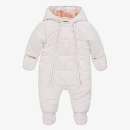 The pink hooded snowsuit offers a delightful blend of style and comfort for baby girls by KENZO KIDS. Crafted with a silky, water-repellent polyester fabric, it features the iconic Elephant logo on the front. Inside, it is lined with plush faux fur and polar fleece for warmth. The snowsuit includes fold-over cuffs, detachable booties with popper fastenings, and two zips for easy dressing, making it an ideal choice for chilly outings. Limited quantities available, so secure yours today.