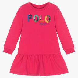 Casual navy blue jumper dress for baby girls by Ralph Lauren, made in sweatshirt jersey with a fleecy inside. Soft against delicate skin, it has a stylish dropped waist, cosy ribbed trims and has a vibrant, tropical-theme multicoloured logo embroidered on the chest for a distinctive branded look. It fastens with buttons on the back. The matching knickers have an elasticated waist and trims for comfort.