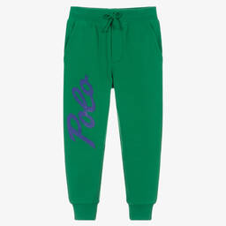Blue joggers for boys by Ralph Lauren, made from super soft cotton jersey. Comfortable on casual days, these joggers have an adjustable drawstring waist and side seam pockets. For a signature look, they have a yellow script logo printed on the front, with the brand's small pony logo embroidered on the yellow back pocket.