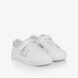 White trainers for girls by Ralph Lauren, with pale pink trims and the brand's iconic Pony logo and script in gold. Casual and comfortable, they are made in soft faux leather, with fabric mesh panels and a fabric lining. They have a padded insole and a non-slip rubber outer sole for good grip. The lace fastening ensures a secure fit.