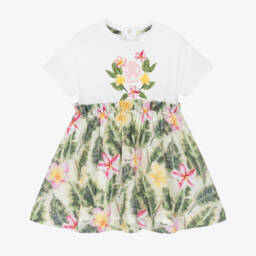 Roberto CavalliПлатье из хлопка с зелеными и белыми листьями для девочек