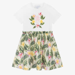 Roberto CavalliПлатье из хлопка с ботаническим принтом в нефритовом и кремовом для девочек
