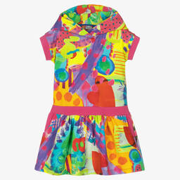 Bright pink dress for girls by Spanish brand Rosalita Señoritas, knitted in a super soft, viscose blend. It has a wide roll neck and and a chiffon flower appliqué on the chest, with a trim on the hemline of embroidered circles. Easy to wear, it simply pulls on over the head.