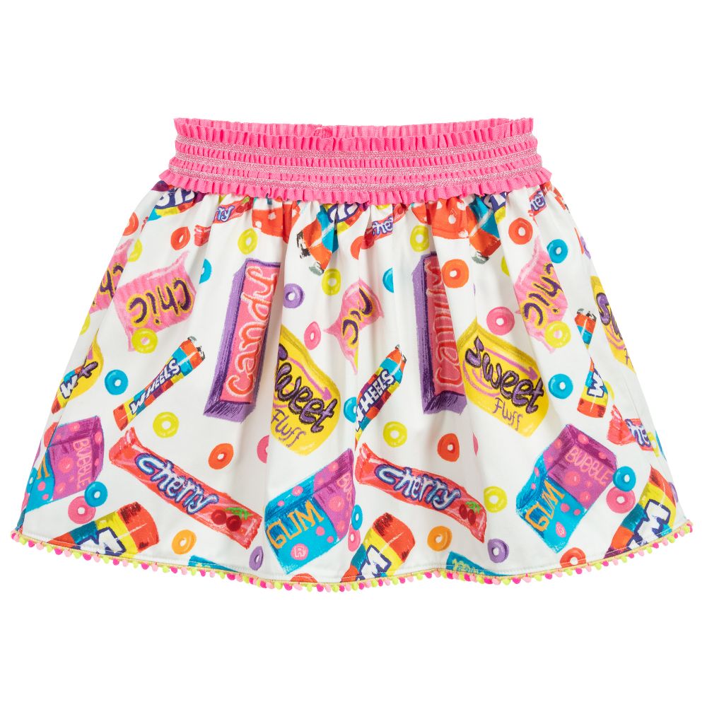 Fun skirt for girls by Rosalita Senoritas. Made in mid-weight, white cotton, it is patterned with a colourful sweetie print. Easy to wear and gathered, it has a comfortable, glittery pink elasticated waistband and a colourful pom-pom trim around the hemline.
